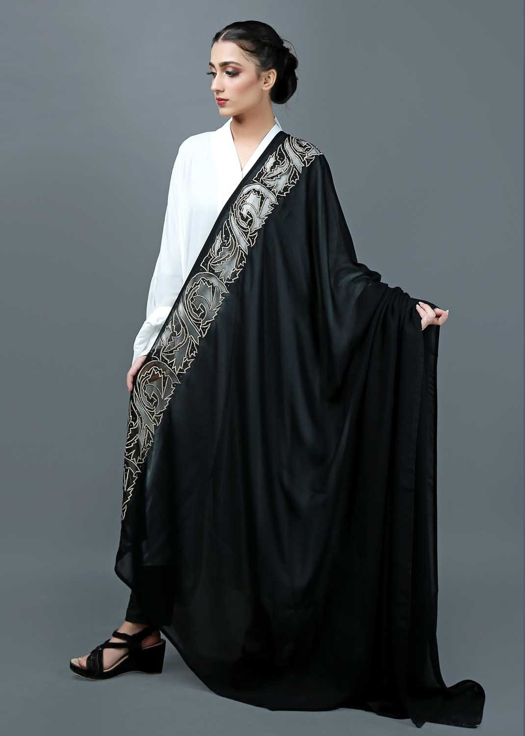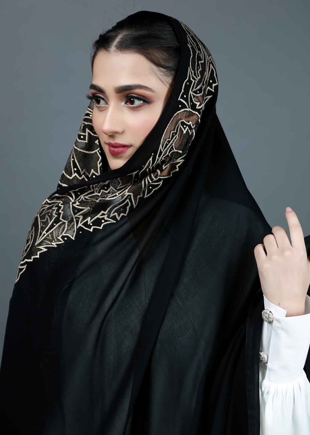 A graceful black chiffon chadar goes with everything. Get this beautiful chadar designed with quality material and studded borders to give you a stylish and modest look.